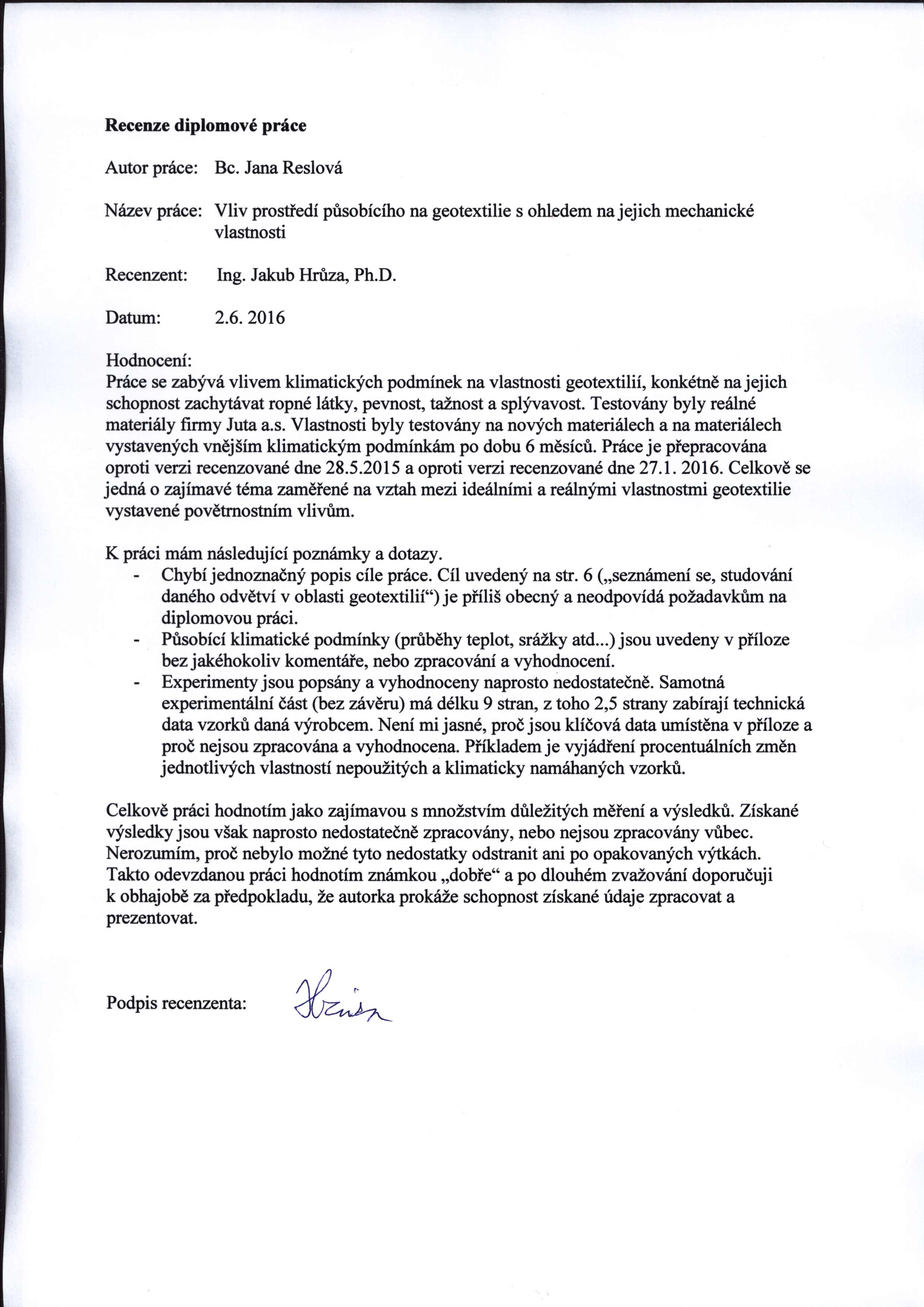 Cílem této diplomové práce bylo seznámení se, studování daného odvětví v oblasti geotextilií. Úkol byl proveden ve spolupráci s firmou JUTA a.s., se sídlem v Hradci Králové, která poskytla své výrobky k provedení experimentu. Jsou zde popsány základní pojmy oboru geotextilií, její historie, technologie a rozdělení. Následují informace o firmě JUTA a.s., se sídlem v Hradci Králové. Dále je proveden experiment s poskytnutými geotextiliemi od firmy JUTA a.s., se sídlem v Hradci Králové. Experiment, který je tvořen z několika částí, následuje zpracování získaných dat, jejich grafické znázornění a vyhodnocení.