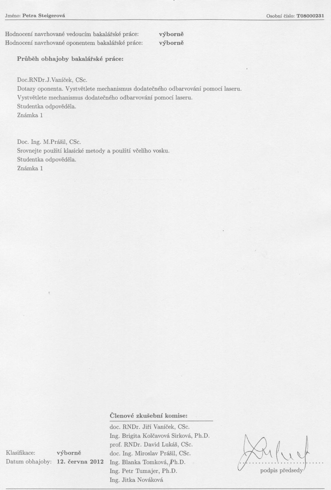 | dc.description.abstract | The aim of this thesis is to explore the blue-print technique which has been known in the world for many centuries. However, all information about it is not fully verified. The aim of the research is primarily the examination of booking presevation agent called "pap", which is commonly used in practise for blue-print effects. The thesis is trying to find out the approximate composition of pap, the way of its application, the quantity of application, the temperature, which is optimal for samples with pap application and their subsequent dying in indigo vat. Another way how to achieve blue-print effect is using wax like paraffin as a preservation agent. The thesis is interested in the application and the temperature which is optimal for samples with the application of wax and their subsequent dying in indigo vat. Laser irradiation of samples is used as an alternative method to the classical way of creating patterns on the fabric. All these methods are evaluated by image analysis. | en |