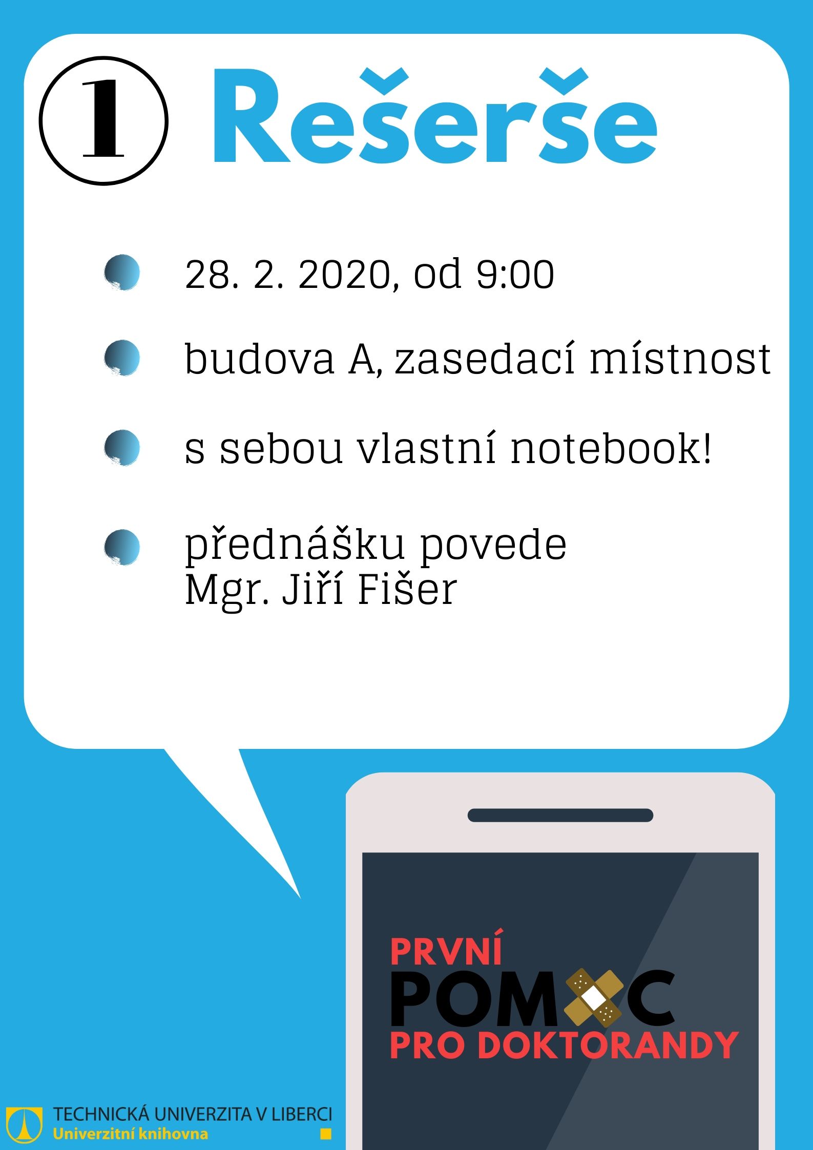 Plakát na přednášku Rešerše, která proběhla v rámci bloku přednášek První pomoc pro doktorandy. Přednášku vedl Mgr. Jiří Fišer